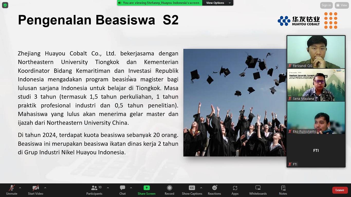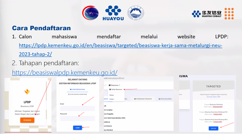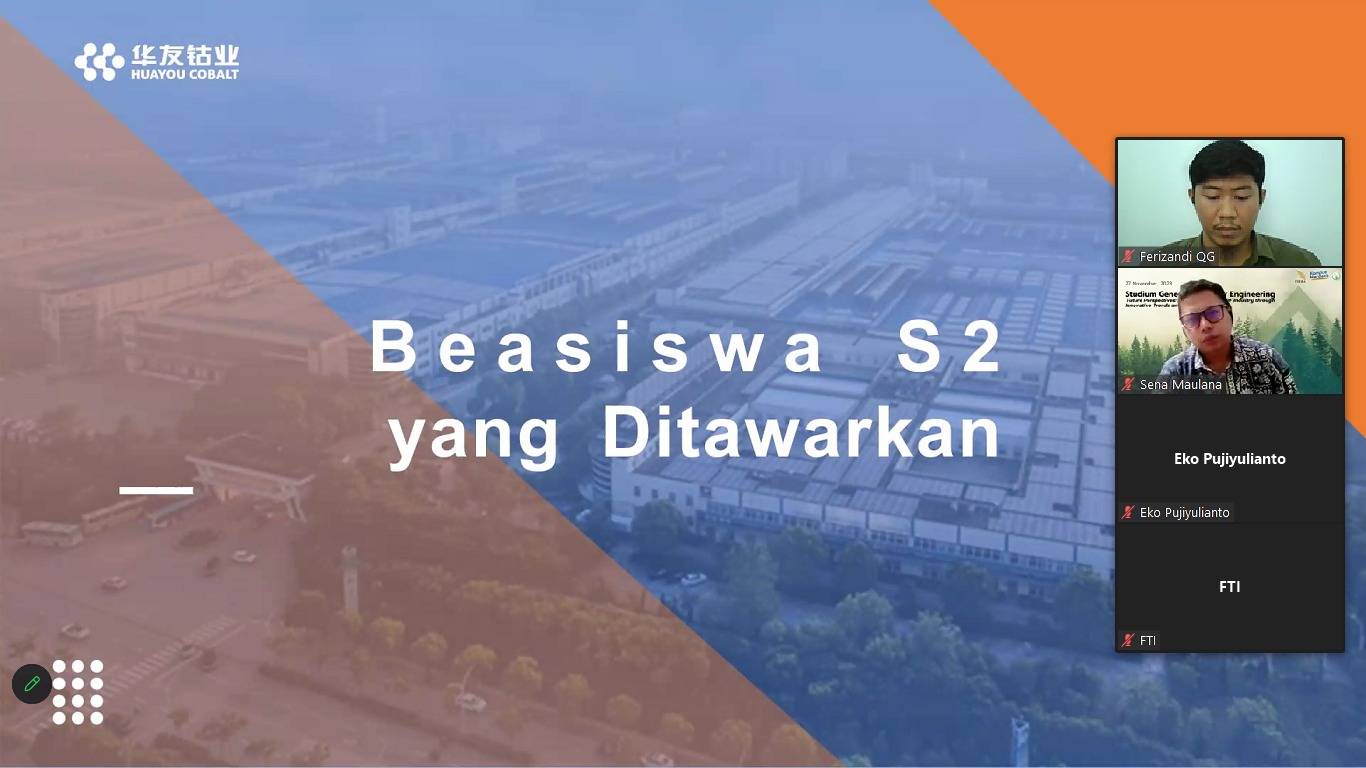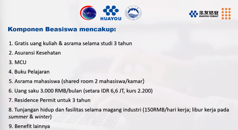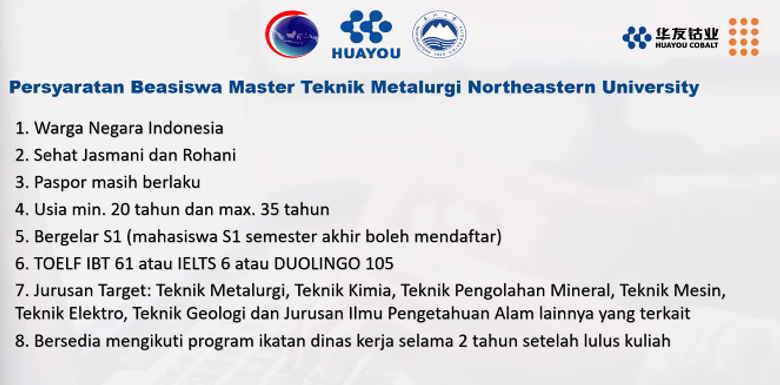Zhejiang Huayou Cobalt Co., Ltd. Bekerjasama dengan Northeastern University Tiongkok dan Kementrian Koordinator Bidang Kemaritiman, dan Investasi Republik Indonesia mengadakan program beasiswa magister bagi lulusan sarjana Indonesia untuk belajar di Tiongkok. Masa studi 3 tahun (1,5 tahun perkuliahan, 1 tahun praktik professional industry dan 0,5 tahun penelitian). Mahasiswa yang lulus akan menerima gelar master dan ijazah dari Northeastern University China.